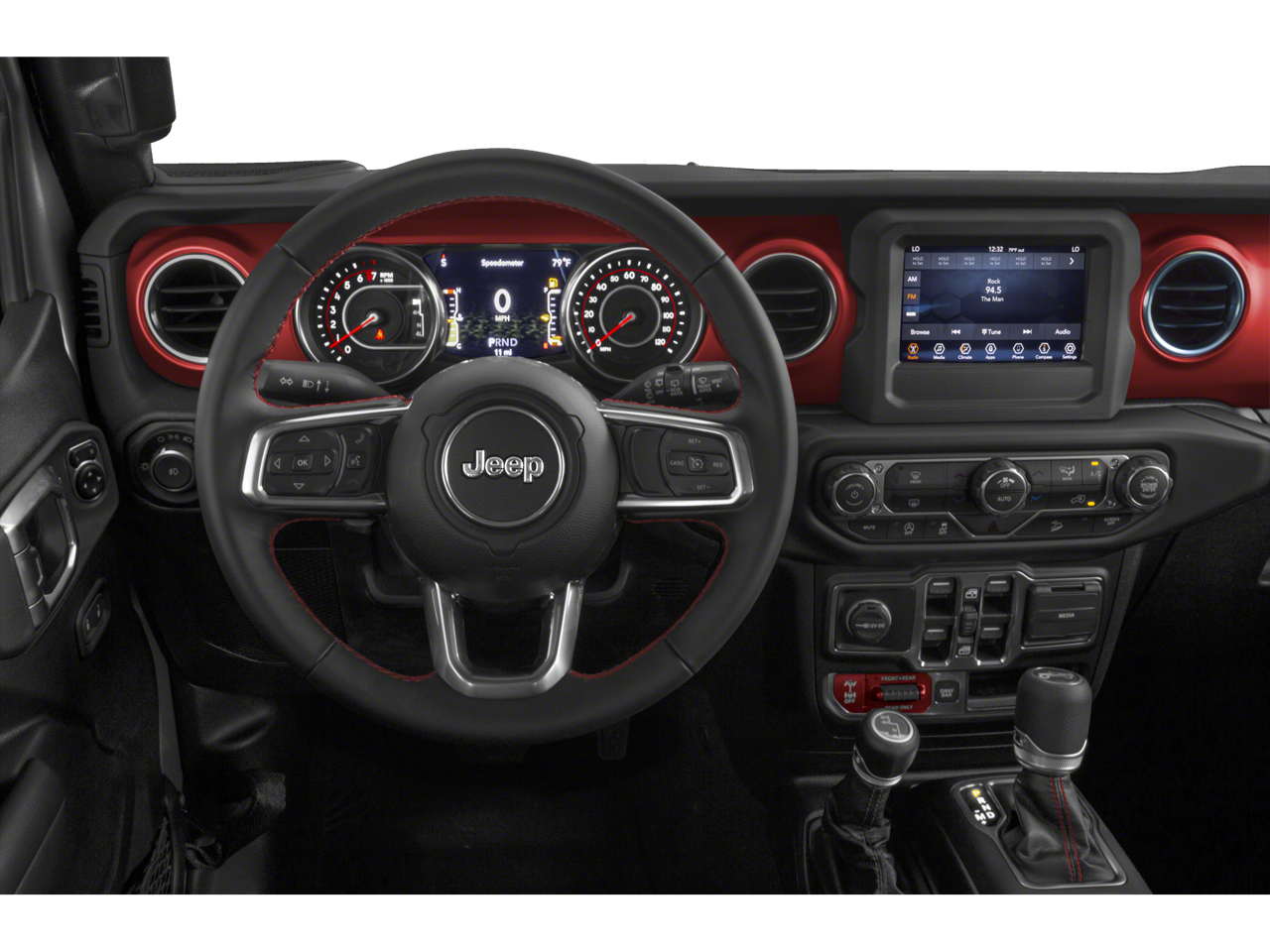 The exterior of this Wrangler Unlimited Rubicon is adorned in a sleek Black Clearcoat finish, complemented by the rugged 17-inch Machined with Black Pockets wheels and LT285/70R17C OWL Off-Road tires. The Dual Top Group, including the Premium Black Sunrider Soft Top and the Black 3-Piece Hard Top, provides unparalleled versatility, allowing you to customize your driving experience.